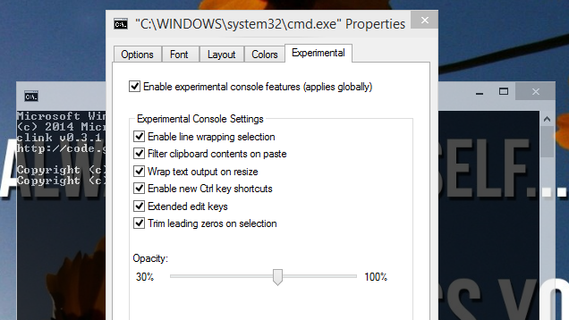 Microsoft announced that Ctrl+V would also work inside the command prompt. However, there is a lot more to this. By Right clicking on the title bar of a command prompt window, you will be able to select Properties. Now click on Experimental tab and you will find that there are several new and fascinating features that you can now activate.